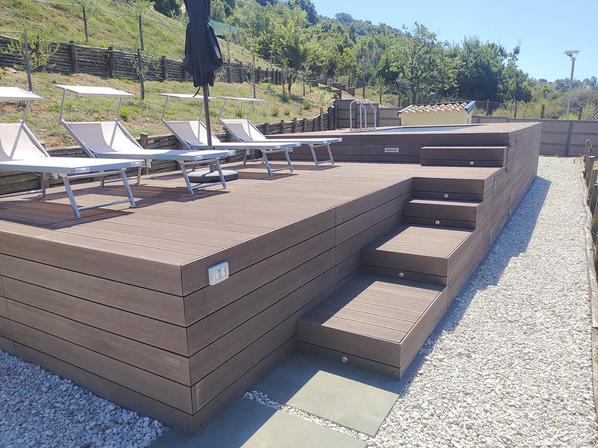 Sono realizzate con struttura portante in acciaio zincato, progettata per garantire resistenza strutturale, precisione di montaggio e lunga durata nel tempo, e possono essere completamente rivestite su misura in WPC (Wood Plastic Composite) per un risultato estetico moderno ed elegante.